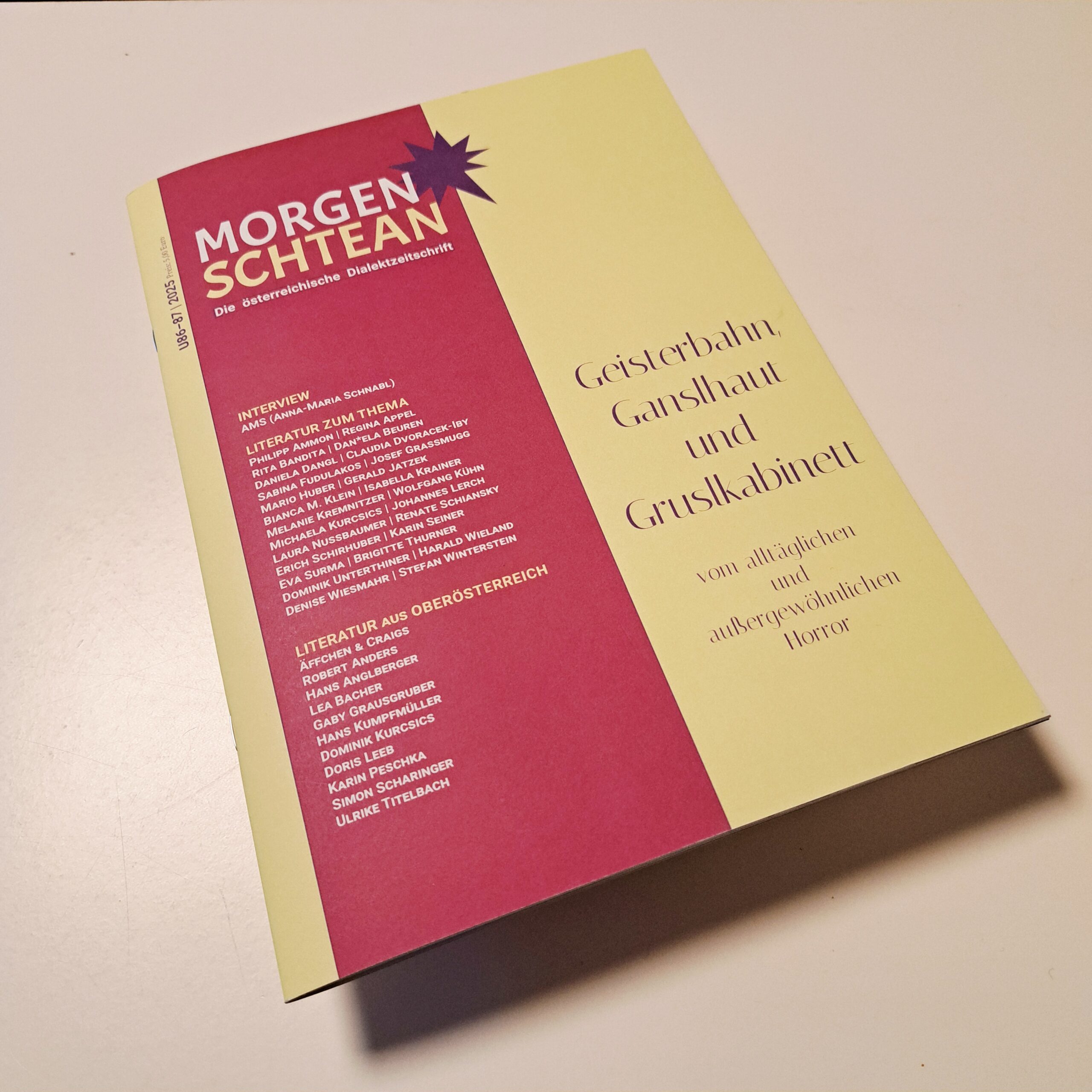 Die aktuelle Ausgabe des Morgenschtean verspricht unter dem Titel „Geisterbahn, Ganslhaut und Gruslkabinett“ Texte zum Fürchten.Vielleicht meinen Sie ja jetzt, dass für eine wirklich grausliche Lektüre eigentlich irgendeine x-beliebige Tageszeitung reicht. Oder die letzte Energiekostenabrechnung. Oder der Steuerbescheid. Oder …